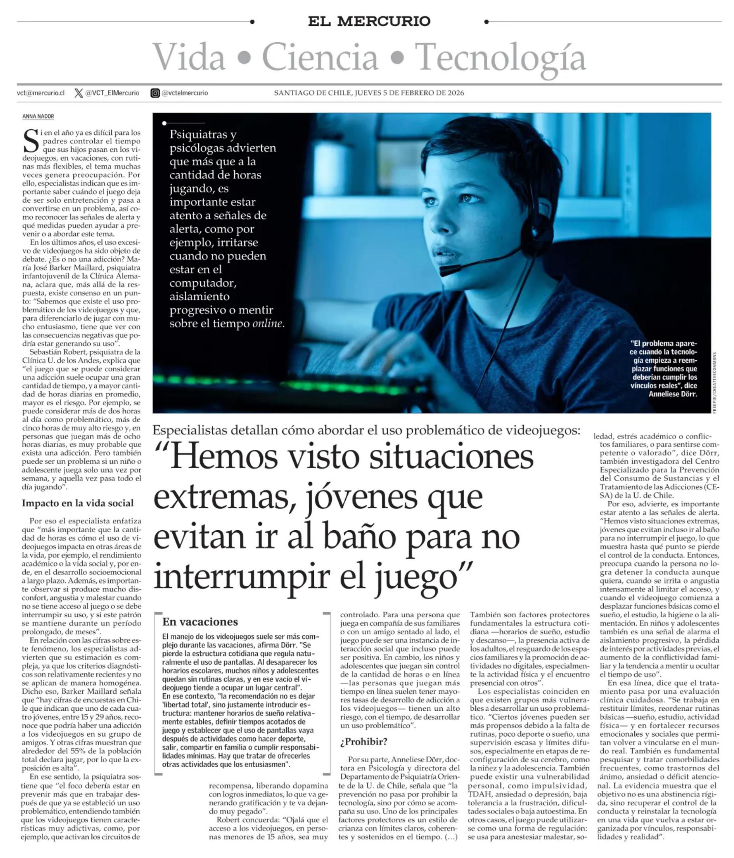 ste medio, la Dra. Anneliese Dörr, directora del Departamento de Psiquiatría y Salud Mental Oriente e investigadora del Centro Especializado para la Prevención y Tratamiento de las Adicciones (CESA) de la Universidad de Chile, señala que “la prevención no pasa por prohibir la tecnología, sino por cómo se acompaña su uso. Uno de los principales factores protectores es un estilo de crianza con límites claros, coherentes y sostenidos en el tiempo. (…) También son factores protectores fundamentales la estructura cotidiana -horarios de sueño, estudio y descanso-, la presencia activa de los adultos, el resguardo de los espacios familiares y la promoción de actividades no digitales, especialmente la actividad física y el encuentro presencial con otros”.